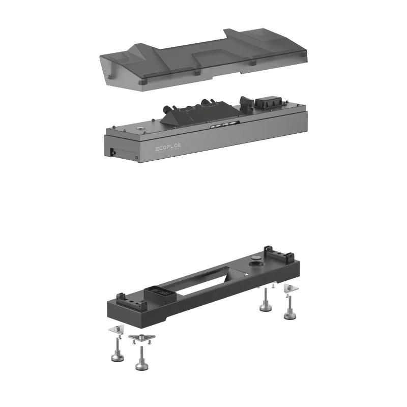 Комплект, включающий батарею EcoFlow LFP 5 кВтч, распределительный блок и базу. Все компоненты предназначены для различных конфигураций комплектов PowerOcean для квартиры, частного дома или офиса.