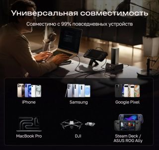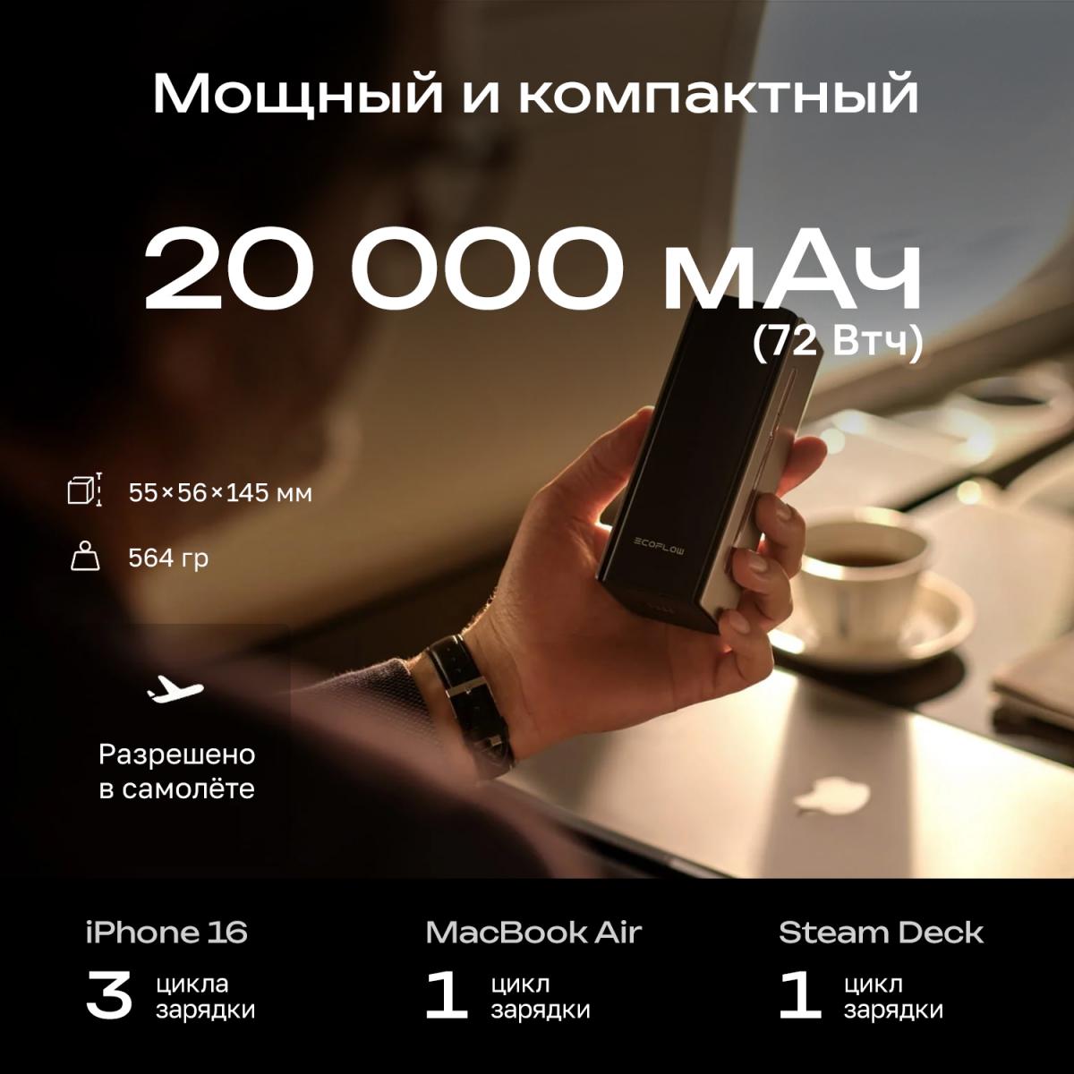 • Компактный размер, мощная производительность аккумулятор 20 000 мАч (72 Втч) – разрешено брать в самолёт