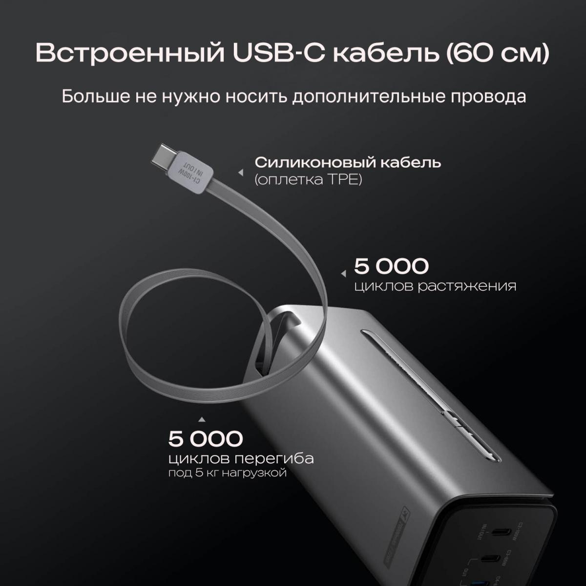 Встроенный кабель: Type-C (двусторонняя быстрая зарядка 100 Вт), длина - 60 см