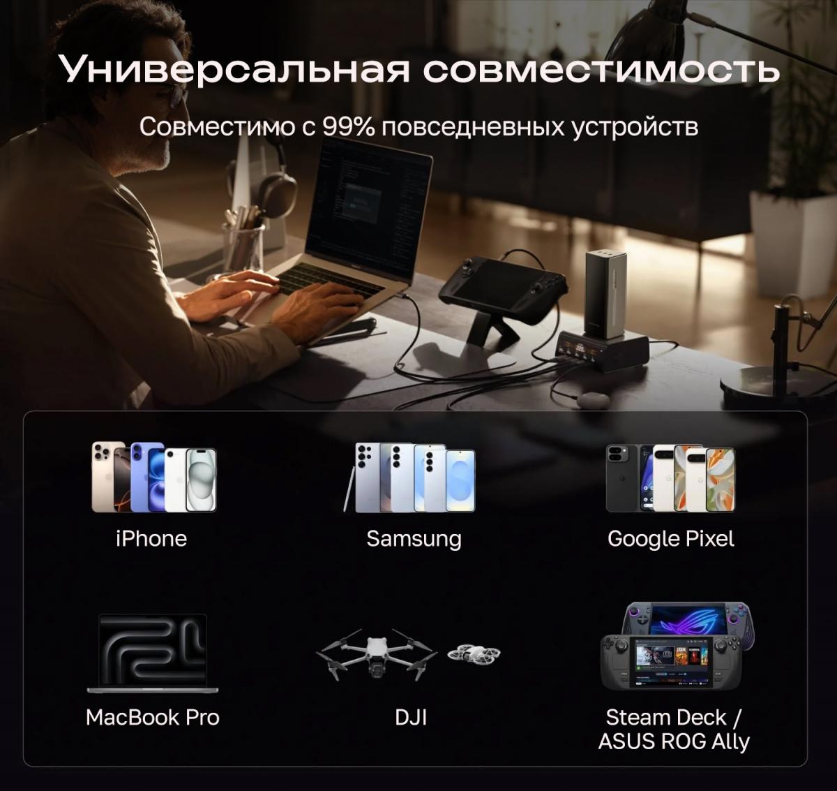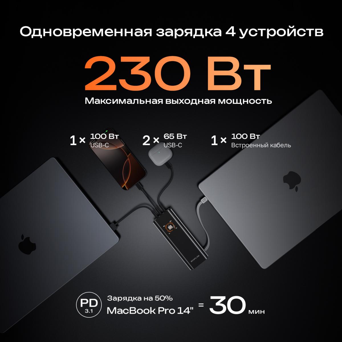 • Зарядка нескольких устройств (230 Вт) общая мощность 230 Вт, встроенный выдвижной кабель USB-C 100 Вт, порт USB-C 100 Вт, 2 порта USB-C по 65 Вт каждый